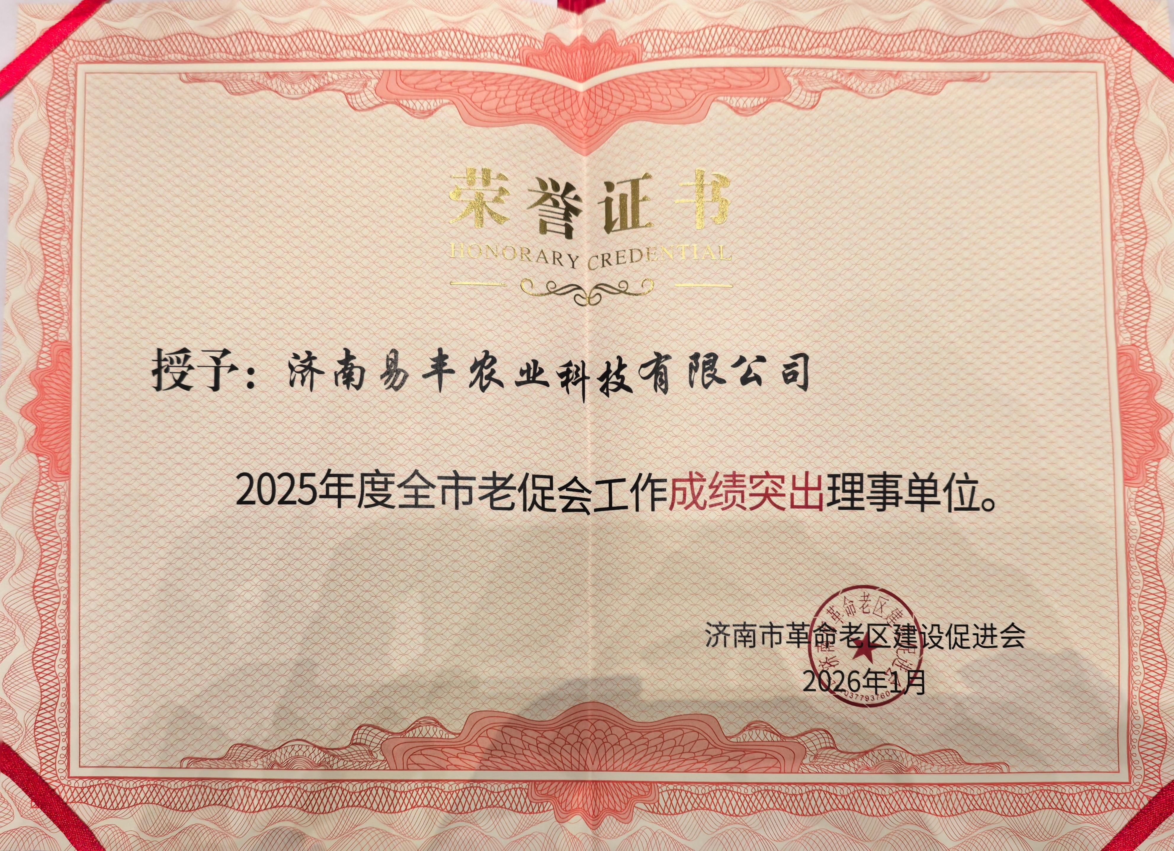 會議全面總結2025年度全市老區(qū)建設工作成效,部署2026年重點任務,并對實績突出的先進單位和個人進行了表彰。易豐農(nóng)業(yè)憑借在革命老區(qū)公益幫扶與社會責任實踐中的優(yōu)異表現(xiàn),榮獲“2025年度全市老促會工作成績突出理事單位”稱號。